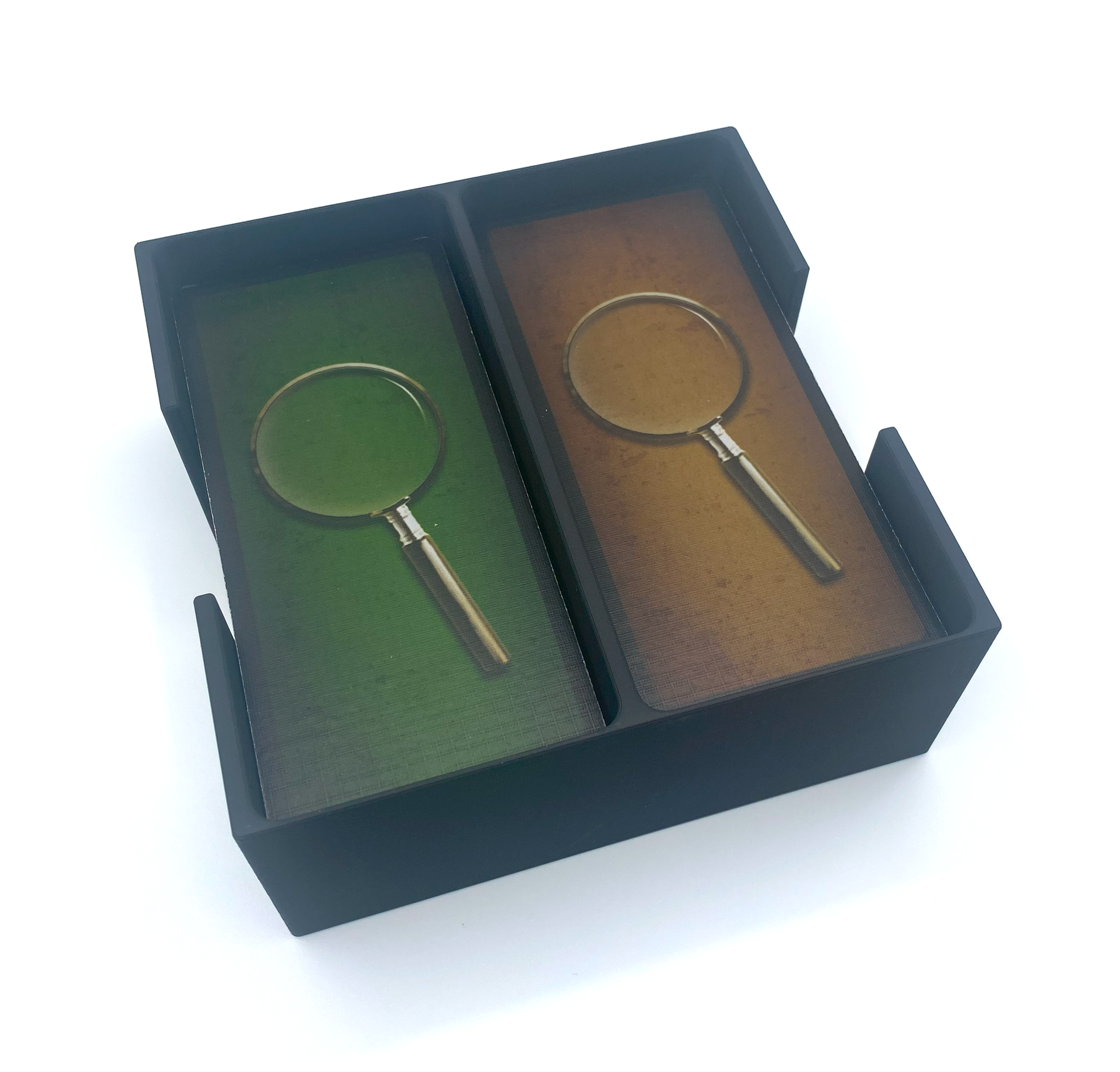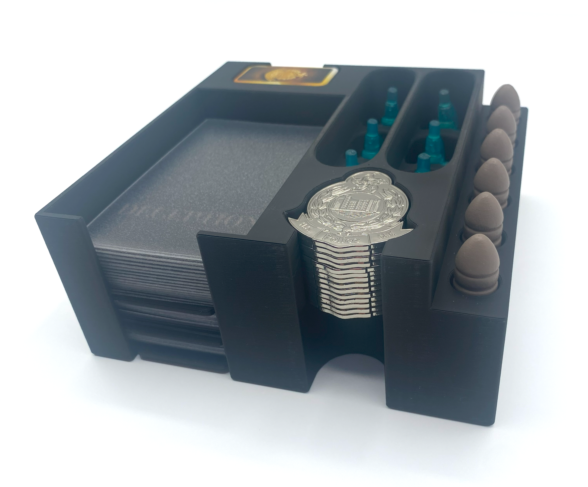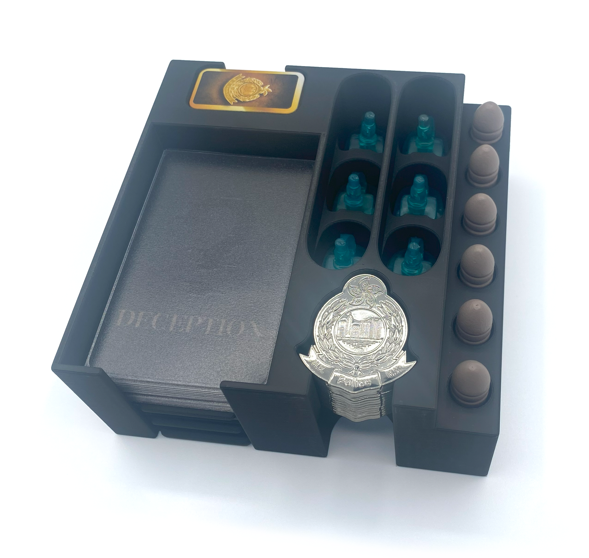 This elegant 4-piece insert is designed for Deception: Murder in Hong Kong, the Undercover Allies expansion, the Upgrade Kit, and all available Theme Packs, Card Packs, and Promo Packs. Everything official that exists for the game has a place in the insert, with room to spare. The insert itself fits in the original game box with no lid lift.