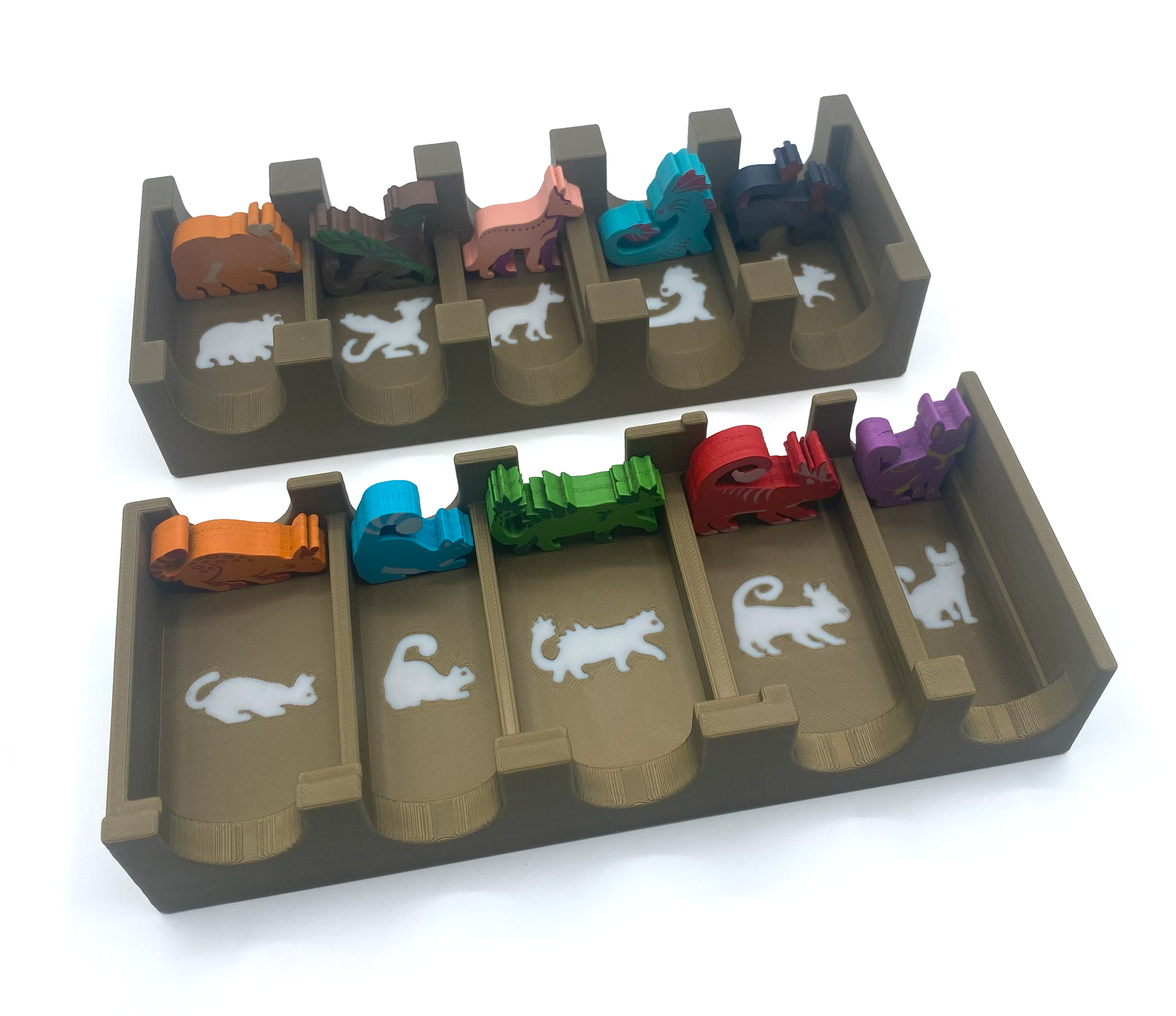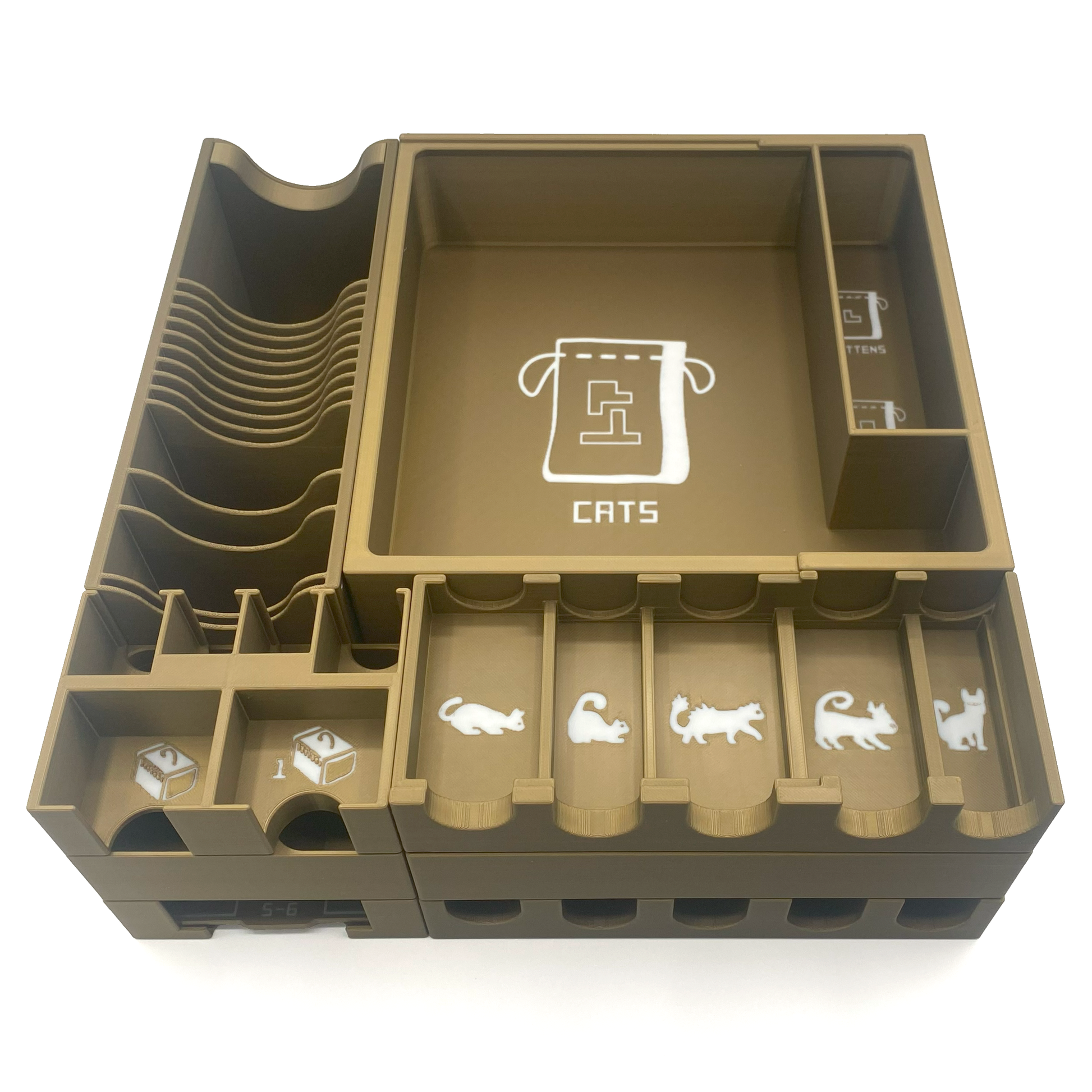 This gorgeous 12-piece insert has been meticulously designed to hold every component of Isle of Cats and all available expansions (except the Boat Pack): Isle of Cats: Base Game, Late Arrivals, Kittens + Beasts, Kickstarter Pack, Kickstarter Pack 2, Treasure Pack, Bag'o'Cats, Bag'o'Fish, Promo Packs 1–3.*