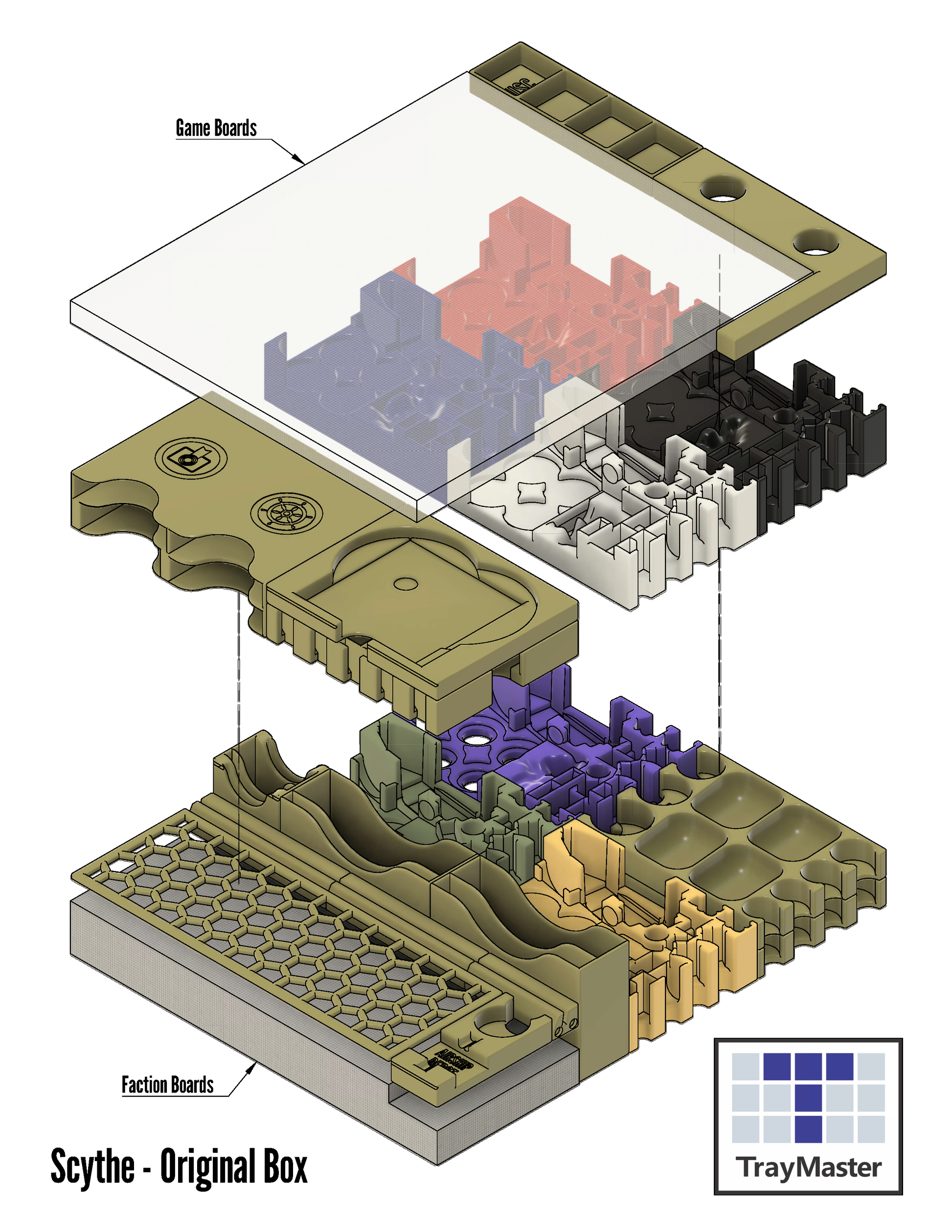 This 22-piece insert for the original Scythe box was designed with the possibility of upgrading to the Legendary box and insert in mind. Only 7 pieces (mostly smaller trays) must be set aside when you upgrade. The remaining 15 pieces, including all the faction trays, can be transferred to the Legendary box.