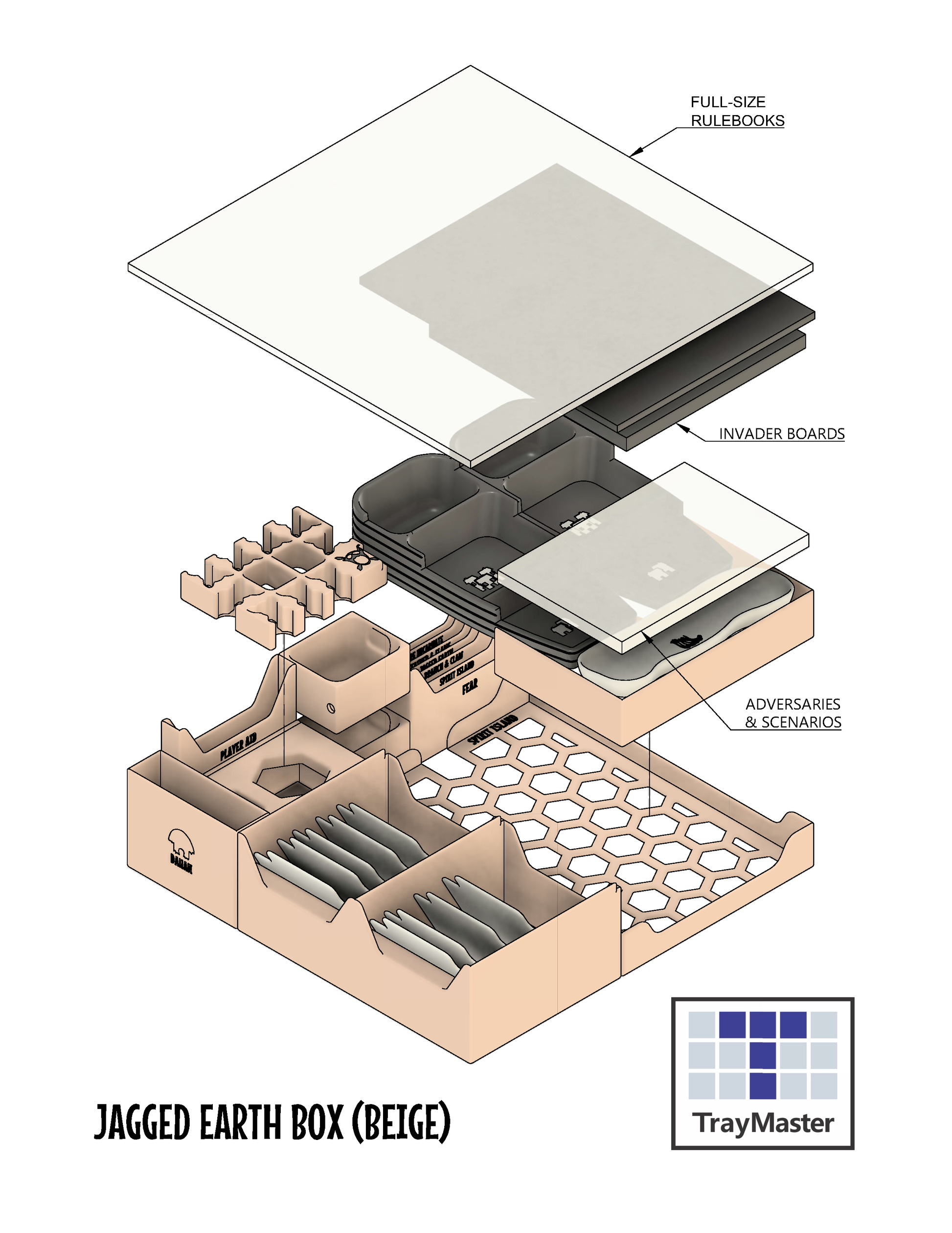 At long last the ultimate Spirit Island storage solution has arrived! This beautiful and highly functional three-color insert fits the base game and every expansion in two boxes—the original Spirit Island box and the Jagged Earth box.